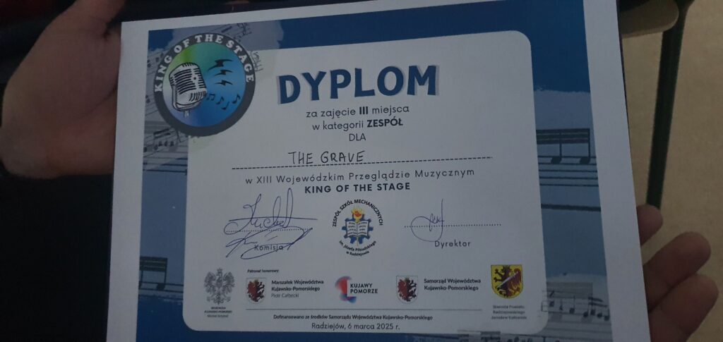 W dniu 06.03.2025 odbyła się kolejna edycja konkursu muzycznego „King of the Stage” w Radziejowie. Wzorem lat ubiegłych uczniowie naszej szkoły wzięli udział w konkursie. W historii występów laureatami konkursu był dwukrotnie zespół „Tetragramaton”, a w ubiegłym roku zespół „Hades”. W tegorocznej odsłonie zespół muzyczny „The Grave”, utworem „Diabelski dom cz.1” zajął III miejsce na 34 wykonawców. Zespół wystąpił w składzie: Jagoda Rogiewicz, Zuzanna Rogiewicz, Łukasz Białkowski, Jakub Białkowski, Wiktor Andrzejak.