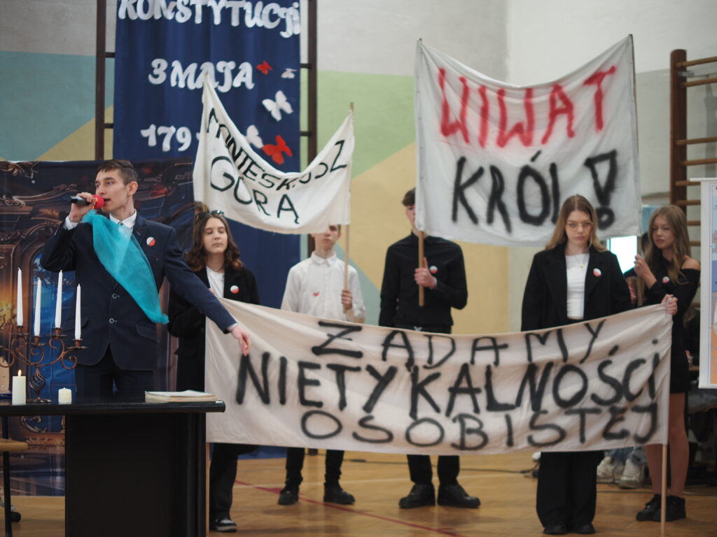 Dziś w naszej szkole uczciliśmy rocznicę uchwalenia Konstytucji 3 Maja. Uroczysty apel przygotowały klasy 2 TIA i 2 TWM pod opieką pani Ewy Kardasz i pani Adrianny Niedziałkowskiej.